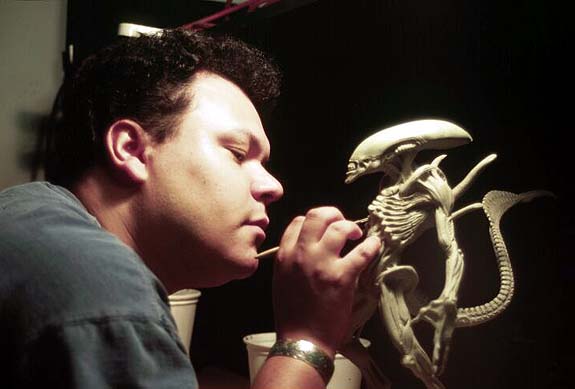 Often times Tom and Alec will present a small scale sculpture or "maquette" to the director for their input before they start sculpting the full scale creature. This is sculptor Jordu Schell working on the maquette for the alien in Alien: Resurection.