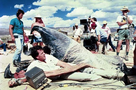 This is a pretty typical day out in the Mojave desert on Tremors. When it would get hot, Tom would jump behind the worm, lay down and just try to take it easy while the rest of the crew worked.