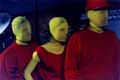 Apparently, they decided the answer to this question was red and yellow pajamas, or psychedelic jump suits.